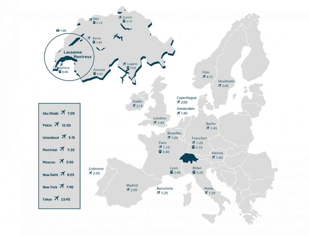 Located in the centre of Europe, Lausanne and Montreux are easily accessible, less than 3 hours by plane from the main European cities. Just 40 minutes from Geneva International Airport and 2.5 hours from Zurich Airport, the region offers easy access and a unique setting.